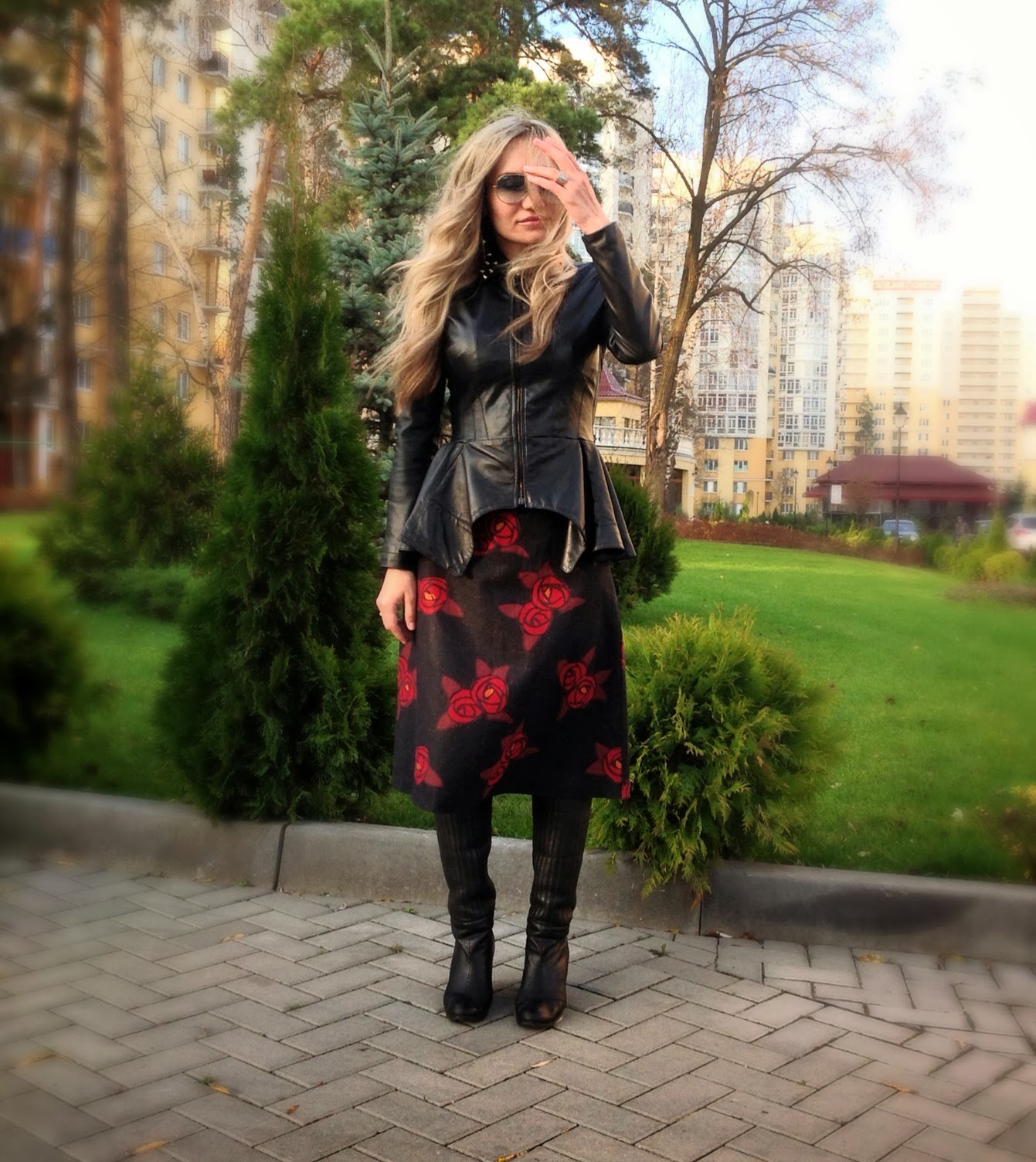Продлевает лето в моем образе сегодня юбка из плотной ткани с ярким цветочным принтом из красных роз, сшита на заказ, так же сапоги Fornarina и моя любимая кожаная курточка с баской, тоже сделана специально для меня талантливым мастером. Пусть эта осень будет теплой для каждого из нас)